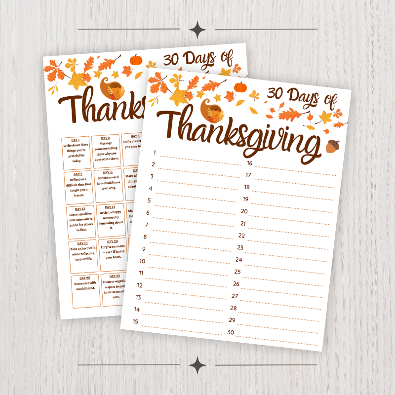 Bring more gratitude and mindfulness to your November with our 30 Days of Thanksgiving challenge, a Thanksgiving activity designed to cultivate appreciation and positivity every day. This cozy autumn-themed set includes guided daily prompts and a 30-day gratitude tracker, perfect for the Thanksgiving season.