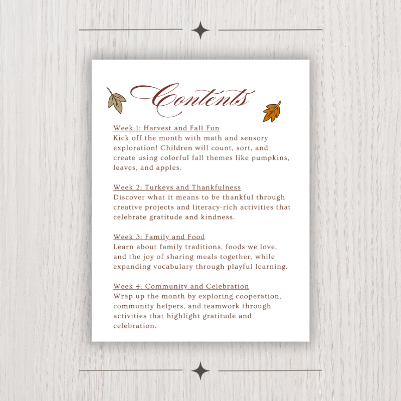 - Fall and Thanksgiving themes that blend play with purposeful learning.