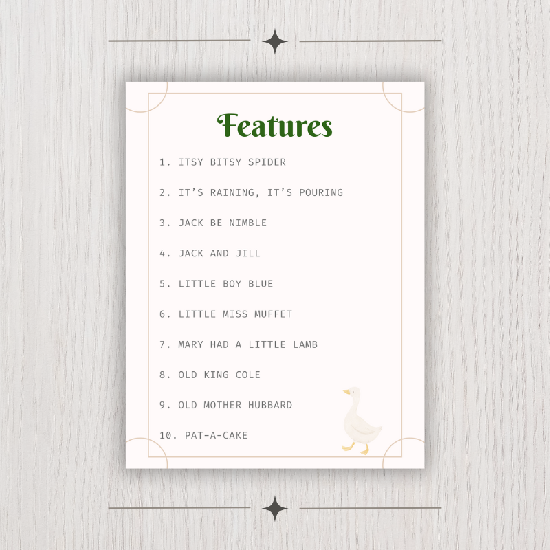 A charming, interactive storytelling resource designed to bring classic nursery rhymes to life for young learners. Volume II includes the full text of 10 more Mother Goose nursery rhymes along with storytelling pieces – colorful, cut-and-play illustrations that help children retell and act out each rhyme. Turn nursery rhymes into hands-on learning fun with this beautifully designed printable set.